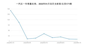 在国内市场上,一汽,在2023年1月的销量为11辆,同比下降93.57%,2022年01月-2023年01月份,一汽累计销量为415辆,较去年同期下降40.63%。