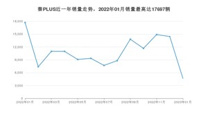 2023年1月,秦PLUS销量为4649辆,同比下降73.73%,环比下降67.79%。2022年01月-2023年01月份,秦PLUS销量为141463辆,同比增长1.25%。