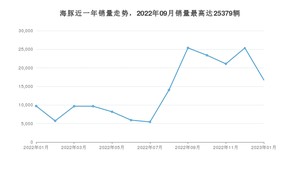 2023年1月,海豚销量为16735辆,同比增长72.03%,环比下降34.02%。2022年01月-2023年01月份,海豚销量为180313辆,同比增长502.65%。