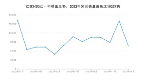 2023年1月,红旗HS5销量为7578辆,同比下降53.3%,环比下降52.63%。2022年01月-2023年01月份,红旗HS5销量为123275辆,同比下降12.75%。