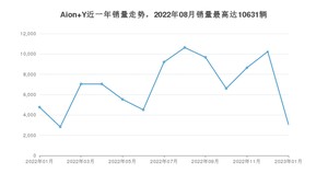 2023年1月,Aion Y销量为3058辆,同比下降35.77%,环比下降70.12%。2022年01月-2023年01月份,Aion Y销量为89758辆,同比增长148.35%。
