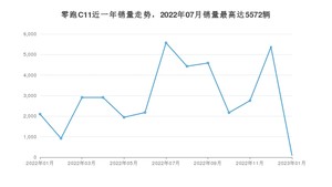 2023年1月,零跑C11销量为93辆,同比下降95.57%,环比下降98.27%。2022年01月-2023年01月份,零跑C11销量为37935辆,同比增长550.35%。