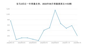 2023年1月,宝马2系销量为199辆,同比下降73.68%,环比下降65.75%。2022年01月-2023年01月份,宝马2系销量为5142辆,同比下降48.23%。