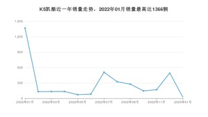 2023年1月,K5凯酷销量为21辆,同比下降98.46%,环比下降95.75%。2022年01月-2023年01月份,K5凯酷销量为3860辆,同比下降75.74%。