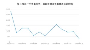 2023年1月,宝马X2销量为306辆,同比下降88.91%,环比下降67.65%。2022年01月-2023年01月份,宝马X2销量为14210辆,同比下降49.18%。