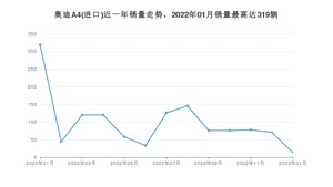 2023年1月,奥迪A4(进口)销量为13辆,同比下降95.92%,环比下降81.69%。2022年01月-2023年01月份,奥迪A4(进口)销量为1280辆,同比下降73.44%。
