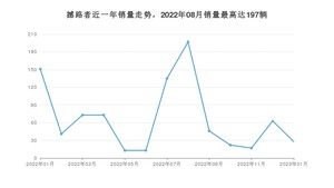 2023年1月,撼路者销量为28辆,同比下降81.46%,环比下降55.56%。2022年01月-2023年01月份,撼路者销量为872辆,同比下降67.6%。