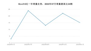 2023年1月,BJ 212销量为15辆,同比增长400%,环比下降31.82%。2022年01月-2023年01月份,BJ 212销量为77辆,同比增长71.11%。