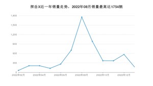 2023年1月,探岳X销量为169辆,环比下降70.3%。2022年01月-2023年01月份,探岳X销量为5781辆,同比下降44.46%。