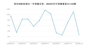 2023年1月,领克09新能源销量为252辆,同比下降73.33%,环比下降77.13%。2022年01月-2023年01月份,领克09新能源销量为9169辆,同比增长854.11%。