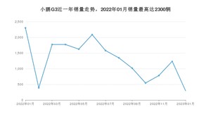 2023年1月,小鹏G3销量为297辆,同比下降87.09%,环比下降75.99%。2022年01月-2023年01月份,小鹏G3销量为16740辆,同比下降45.92%。