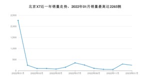 2023年1月,北京X7销量为245辆,同比下降89.18%,环比下降18.06%。2022年01月-2023年01月份,北京X7销量为4296辆,同比下降81.72%。