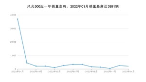 2023年1月,风光500销量为204辆,同比下降94.47%,环比下降18.73%。2022年01月-2023年01月份,风光500销量为6359辆,同比下降82.35%。