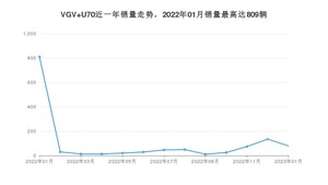 2023年1月,VGV U70销量为79辆,同比下降90.23%,环比下降41.48%。2022年01月-2023年01月份,VGV U70销量为1333辆,同比下降80.66%。