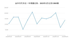 2023年2月,金华市汽车总销量为13895辆,同比增长30.64%,环比增长97.54%。2022年02月-2023年02月份,金华市总销量为182359辆,同比下降8.32%。在最近1年中,金华市销量在2022年07月达到最高,销量为20980辆。