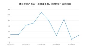 2023年2月,嘉峪关市汽车总销量为28辆,同比下降6.67%,环比增长115.38%。2022年02月-2023年02月份,嘉峪关市总销量为534辆,同比下降84.22%。在最近1年中,嘉峪关市销量在2022年08月达到最高,销量为109辆。