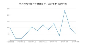 2023年2月,铜川市汽车总销量为56辆,同比下降39.13%,环比下降41.67%。2022年02月-2023年02月份,铜川市总销量为1121辆,同比下降74.64%。在最近1年中,铜川市销量在2022年12月达到最高,销量为235辆。
