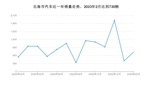 2023年2月,北海市汽车总销量为730辆,同比增长33.7%,环比增长83.88%。2022年02月-2023年02月份,北海市总销量为11437辆,同比下降39.89%。在最近1年中,北海市销量在2022年12月达到最高,销量为1916辆。