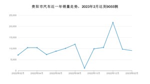 2023年2月,贵阳市汽车总销量为9055辆,同比增长28.39%,环比下降6.45%。2022年02月-2023年02月份,贵阳市总销量为127734辆,同比下降21.44%。在最近1年中,贵阳市销量在2022年12月达到最高,销量为21743辆。