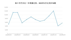 2023年2月,海口市汽车总销量为5736辆,同比增长13.74%,环比增长40.55%。2022年02月-2023年02月份,海口市总销量为102008辆,同比下降32.15%。在最近1年中,海口市销量在2022年12月达到最高,销量为12061辆。