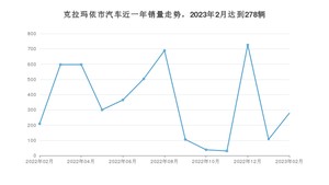2023年2月,克拉玛依市汽车总销量为278辆,同比增长33.01%,环比增长162.26%。2022年02月-2023年02月份,克拉玛依市总销量为4544辆,同比下降59.22%。在最近1年中,克拉玛依市销量在2022年12月达到最高,销量为726辆。