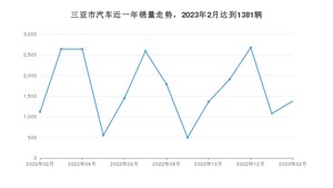 2023年2月,三亚市汽车总销量为1381辆,同比增长22.97%,环比增长28.23%。2022年02月-2023年02月份,三亚市总销量为21686辆,同比下降43.69%。在最近1年中,三亚市销量在2022年12月达到最高,销量为2675辆。