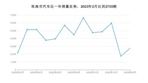 2023年2月,珠海市汽车总销量为2755辆,同比增长24.83%,环比增长58.24%。2022年02月-2023年02月份,珠海市总销量为57153辆,同比下降17.98%。在最近1年中,珠海市销量在2022年09月达到最高,销量为6658辆。