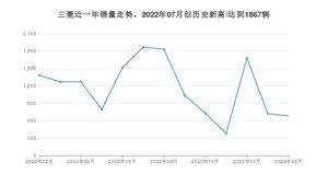 在国内市场上,三菱,在2023年2月的销量为683辆,同比下降50.65%,环比下降5.27%。2022年02月-2023年02月份,三菱累计销量为15160辆,较去年同期下降77.06%。