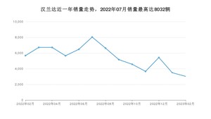 2023年2月,汉兰达销量为3024辆,同比下降46.68%,环比下降13.38%。2022年02月-2023年02月份,汉兰达销量为71193辆,同比下降36.22%。
