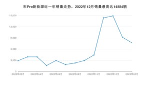 2023年2月,宋Pro新能源销量为7672辆,同比增长165.65%,环比下降16.28%。2022年02月-2023年02月份,宋Pro新能源销量为72803辆,同比增长749.91%。