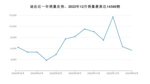 2023年2月,途岳销量为5494辆,同比下降12.99%,环比下降15.48%。2022年02月-2023年02月份,途岳销量为97998辆,同比下降31.74%。