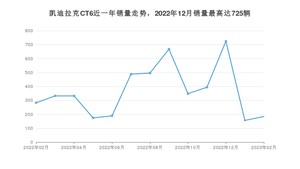 2023年2月,凯迪拉克CT6销量为184辆,同比下降34.98%,环比增长17.95%。2022年02月-2023年02月份,凯迪拉克CT6销量为4769辆,同比下降74.46%。