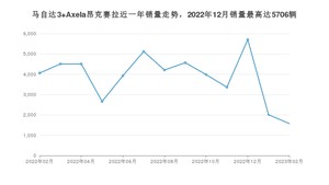 2023年2月,马自达3 Axela昂克赛拉销量为1574辆,同比下降61.22%,环比下降21.65%。2022年02月-2023年02月份,马自达3 Axela昂克赛拉销量为50204辆,同比下降47.67%。