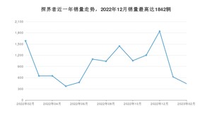 2023年2月,探界者销量为440辆,同比下降72.24%,环比下降29.15%。2022年02月-2023年02月份,探界者销量为12465辆,同比下降65.36%。