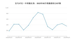 2023年2月,宝马X7销量为351辆,同比增长87.7%,环比下降21.12%。2022年02月-2023年02月份,宝马X7销量为5647辆,同比下降50.4%。