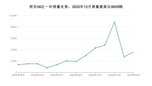 2023年2月,领克06销量为3588辆,同比增长167.36%,环比增长31.24%。2022年02月-2023年02月份,领克06销量为37583辆,同比下降22.6%。