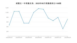 2023年2月,威霆销量为730辆,同比增长54.33%,环比增长138.56%。2022年02月-2023年02月份,威霆销量为10243辆,同比下降46%。