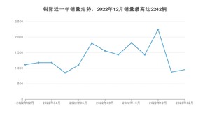 2023年2月,锐际销量为950辆,同比下降14.57%,环比增长8.82%。2022年02月-2023年02月份,锐际销量为17501辆,同比下降48.54%。