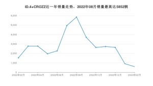 2023年2月,ID.4 CROZZ销量为600辆,同比下降60.96%,环比下降33.92%。2022年02月-2023年02月份,ID.4 CROZZ销量为35334辆,同比增长35.49%。