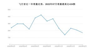 2023年2月,飞行家销量为168辆,同比下降30.29%,环比下降19.23%。2022年02月-2023年02月份,飞行家销量为3549辆,同比下降73.21%。