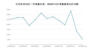 2023年2月,长安欧尚X5销量为1078辆,同比下降78.95%,环比下降58.93%。2022年02月-2023年02月份,长安欧尚X5销量为61049辆,同比下降55.2%。