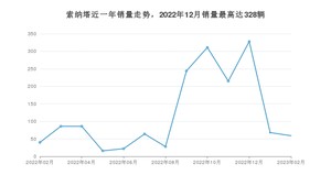 2023年2月,索纳塔销量为59辆,同比增长47.5%,环比下降13.24%。2022年02月-2023年02月份,索纳塔销量为1567辆,同比下降82.52%。