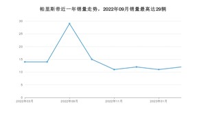 2023年2月,帕里斯帝销量为12辆,环比增长9.09%。2022年02月-2023年02月份,帕里斯帝销量为118辆,同比下降89.18%。