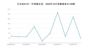 2023年2月,比亚迪D1销量为25辆,同比下降40.48%,2022年02月-2023年02月份,比亚迪D1销量为709辆,同比下降90.37%。