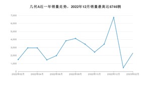 2023年2月,几何A销量为2295辆,同比增长53.51%,环比增长408.87%。2022年02月-2023年02月份,几何A销量为37522辆,同比增长138.67%。