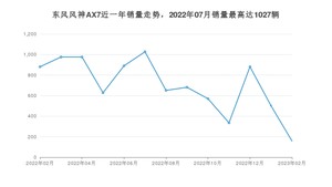 2023年2月,东风风神AX7销量为158辆,同比下降82.07%,环比下降68.53%。2022年02月-2023年02月份,东风风神AX7销量为9156辆,同比下降65.86%。