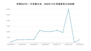 2023年2月,奔腾NAT销量为604辆,同比增长202%,环比增长375.59%。2022年02月-2023年02月份,奔腾NAT销量为19573辆,同比增长604.06%。