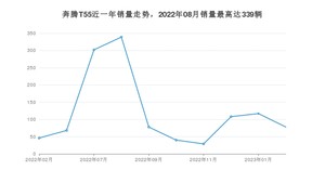 2023年2月,奔腾T55销量为78辆,同比增长69.57%,环比下降33.33%。2022年02月-2023年02月份,奔腾T55销量为1205辆,同比下降85.91%。