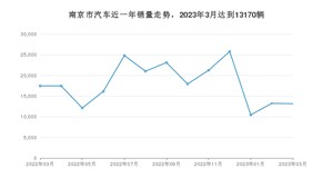 2023年3月,南京市汽车总销量为13170辆,同比下降24.66%,环比下降0.65%。2022年03月-2023年03月份,南京市总销量为234090辆,同比下降8.71%。在最近1年中,南京市销量在2022年12月达到最高,销量为25791辆。