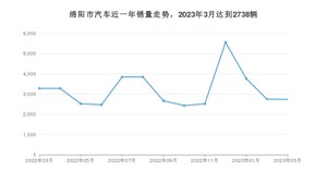 2023年3月,绵阳市汽车总销量为2738辆,同比下降16.58%,环比下降0.47%。2022年03月-2023年03月份,绵阳市总销量为41681辆,同比下降32.32%。在最近1年中,绵阳市销量在2022年12月达到最高,销量为5558辆。